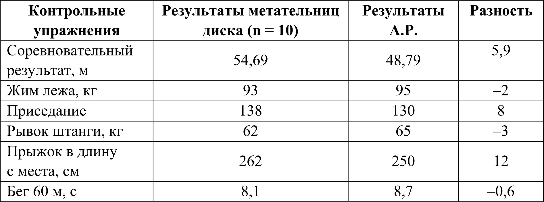 Таблица 2 содержит результаты сопоставления данных об уровне специальной физической и технической подготовленности десяти метательниц диска высокой квалификации с собственными результатами автора статьи (спортсменка А.Р.). Как видно из таблицы, спортсменка А.Р. превосходит метательниц диска в силовой подготовленности и заметно уступает им в скоростной и скоростно-силовой подготовленности.
