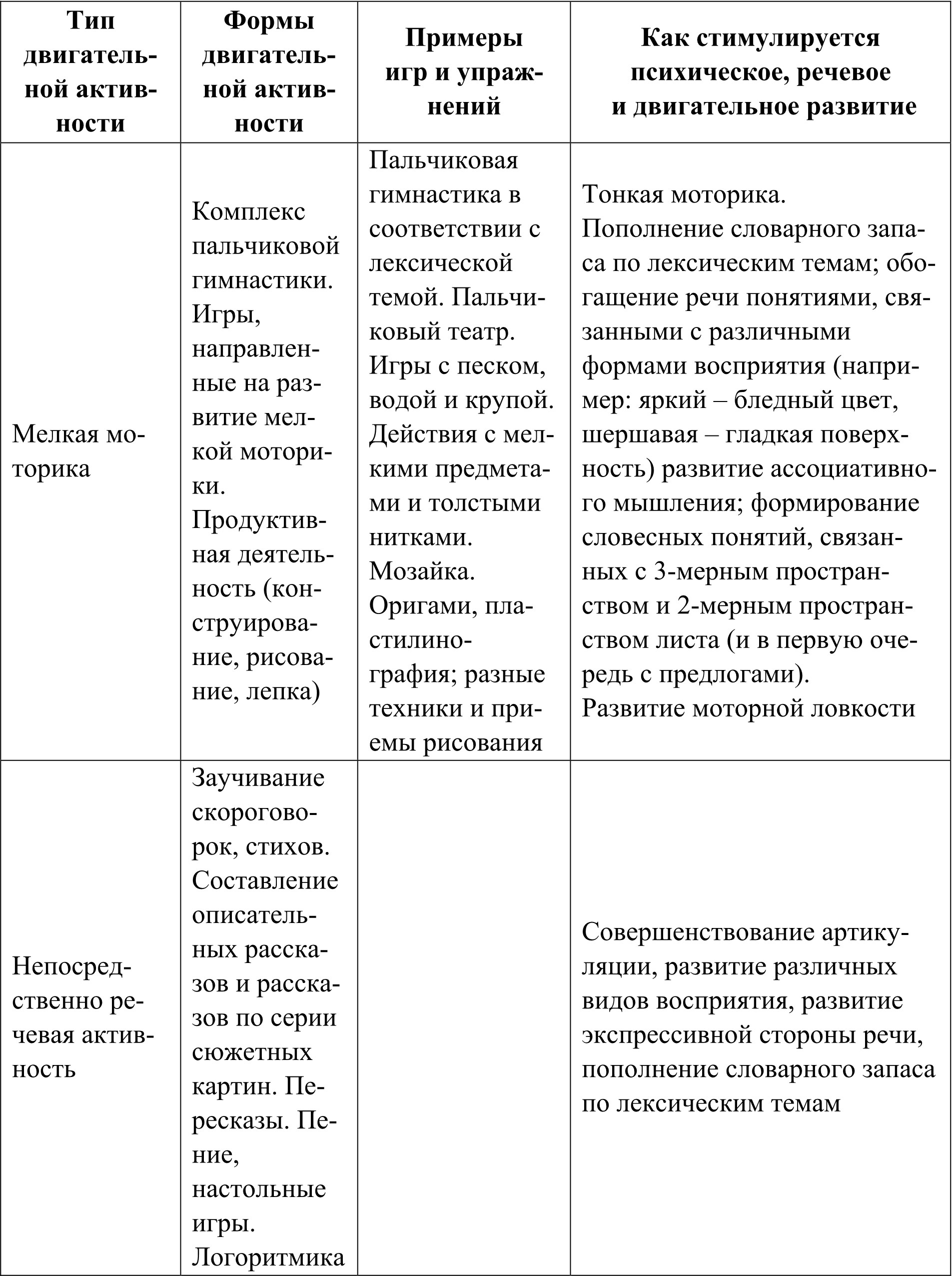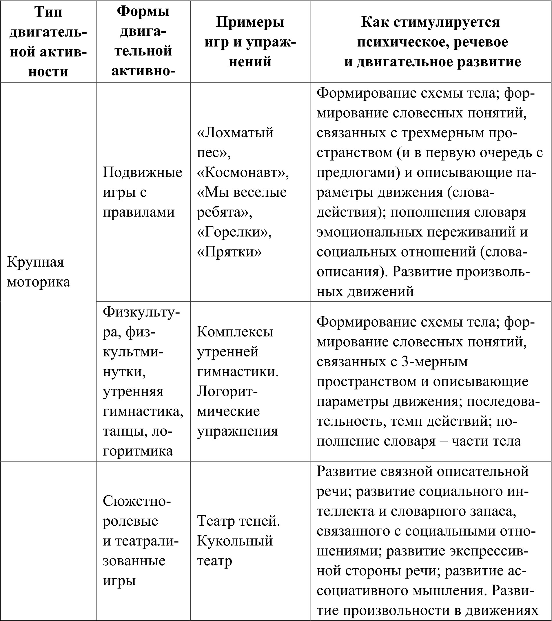 Примеры форм двигательной активности, игр и упражнений для стимулирования психического, речевого и двигательного развития ребенка