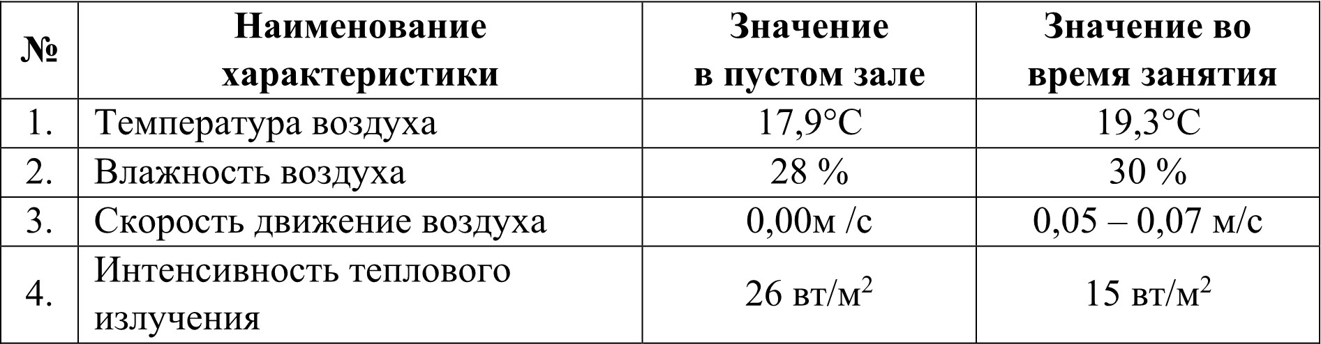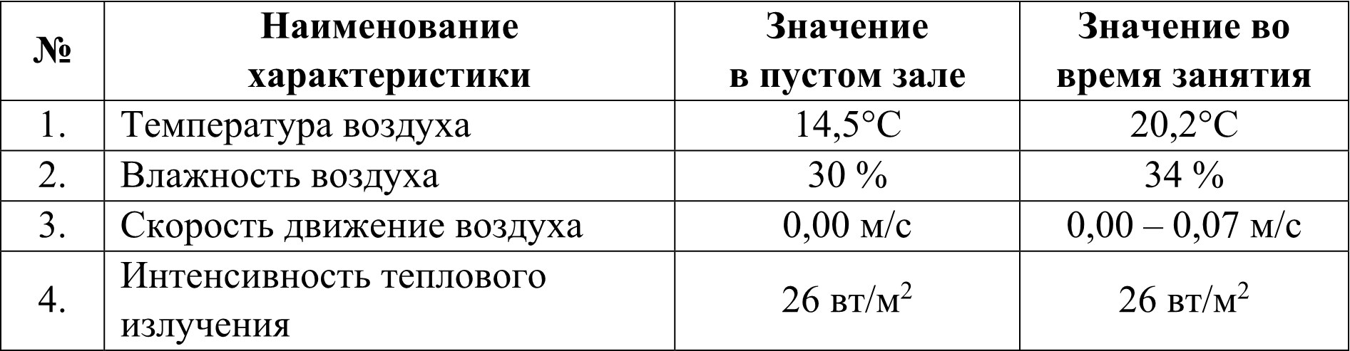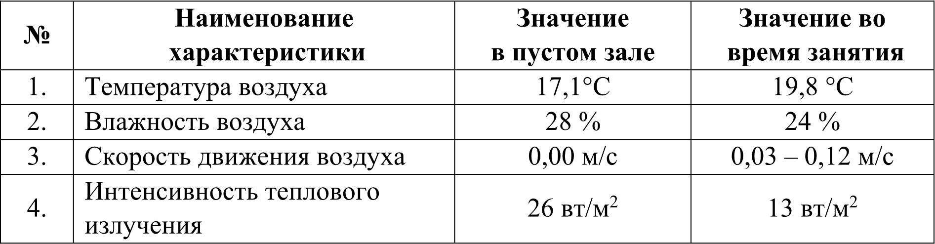 Во всех залах во время занятий температура воздуха поднялась выше нормы. Влажность воздуха не соответствует нормам СанПин. Скорость движения воздуха изменяется в зависимости от характера занятия и находится в пределах нормы.