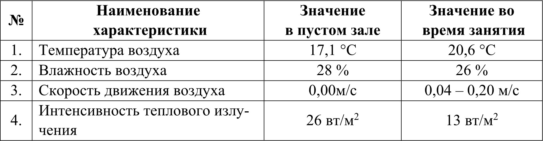 Сравнивая показатели нормативных актов и полученных при исследовании универсального спортивного зала № 1 МПГУ, можно отметить, что влажность и скорость движения воздуха не соответствуют установленным интервалам. Температура зала во время занятия становится выше нормы, что свидетельствует о недостаточной работе вентиляции. Влажность и скорость движения воздуха в универсальном спортивном зале № 2 не удовлетворяют установленным рамкам (см. табл. 3).