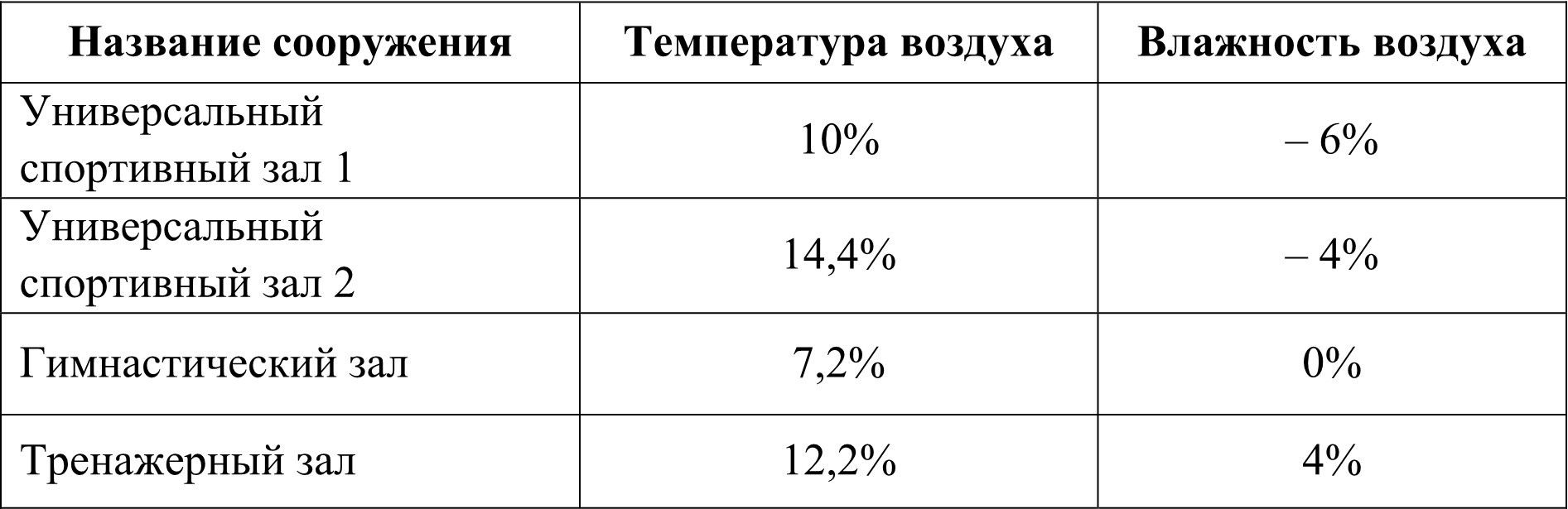 Параметры отклонения температуры и влажности воздуха от нормальных значений в спортивных сооружениях МПГУ