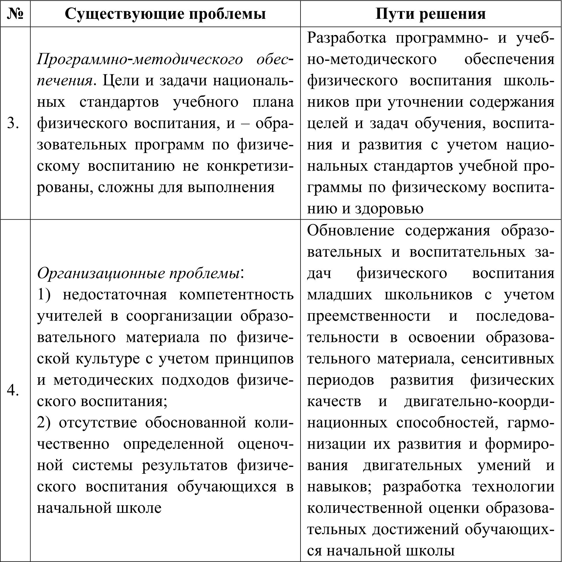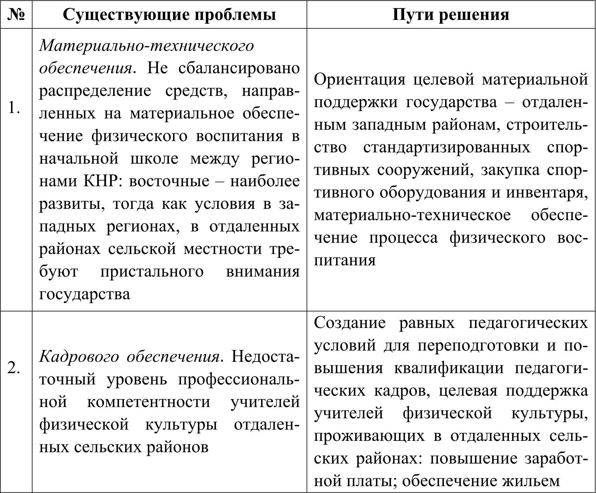 Выводы. Проведенные исследование позволяют обозначить пути совершенствования физического воспитания обучающихся в начальной школе Китая, которые отражаются в необходимом материально-техническом, кадровом, программно-методическом обеспечении, эффективном решении организационных проблем. Контексты задач физического воспитания обучающихся в начальной школе (образовательные, воспитательные и оздоровительные) содержательно развиваются, и на фоне увеличения объема требований к освоению учебного материала требуют включения образовательного пространства внеучебной деятельности и пространства семейного быта в формирование предметных, метапредметных и личностных результатов обучения и воспитания младших школьников.