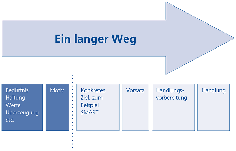 Das Wollen, die dritte Dimension von Kompetenzentwicklung, wird häufig unterschätzt. Der Faktor Wollen hat aber auf dem Weg vom Wissen zum kompetenten Handeln eine wichtige Funktion. Für diesen Weg hat Gollwitzer (1996, S. 533) nach Storch und Krause (2007) das «Rubikonmodell» entwickelt:
