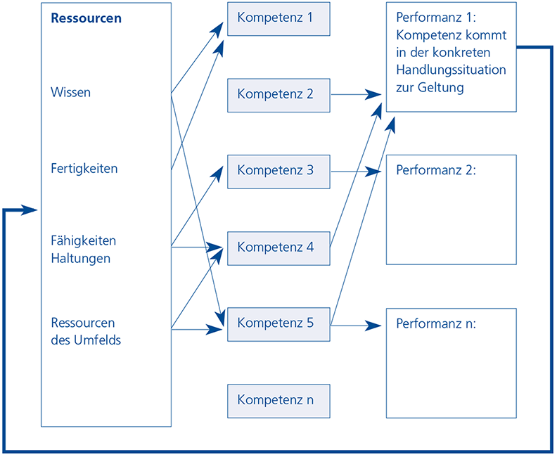 Einzelne Kompetenzen werden durch das Erschliessen von Ressourcen wie Wissen, Erfahrungen, Fertigkeiten, Fähigkeiten und Haltungen erworben. Mehrere Kompetenzen zusammen wie Fachkompetenzen, Sozial-, Methoden- und Selbstkompetenzen, bilden das Potenzial, um eine Situation im Alltag oder Beruf zu bewältigen.