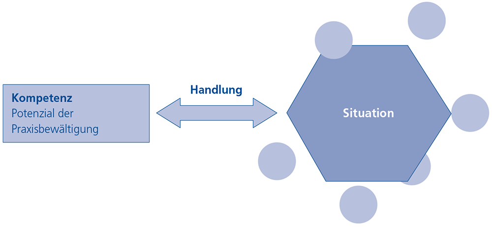 Der Begriff Kompetenz wird zurzeit sehr unterschiedlich und kontrovers diskutiert. Kompetenz kann einerseits als Voraussetzung resp. Potenzial für das Handeln gesehen werden. Umgekehrt wird Kompetenz erst durch Handlung sichtbar. Im Sinne von Le Boterf (1998) werden Kompetenzen aus Ressourcen wie Wissen, Fertigkeiten, Haltungen, Erfahrungen etc. generiert und in konkreten Situationen in der Praxis unter Beweis gestellt. Dieses sichtbare Handeln, welches auf bestimmte Kompetenzen zurückschliessen lässt, nennen wir Performanz. Kompetenz ist das Potenzial zur Praxisbewältigung, dessen Grundlage neben Wissen, Fertigkeiten, Erfahrungen, Haltungen auch soziale Ressourcen sein können. So verstanden zeigt sich Kompetenz darin, dass bestimmte Situationen (Situationsprototypen) adäquat bewältigt werden können, indem auf entsprechende Ressourcen zurückgegriffen wird.