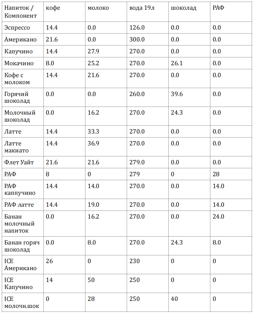 Таблица 1. Технологические параметры и граммовки напитков KofeLift
