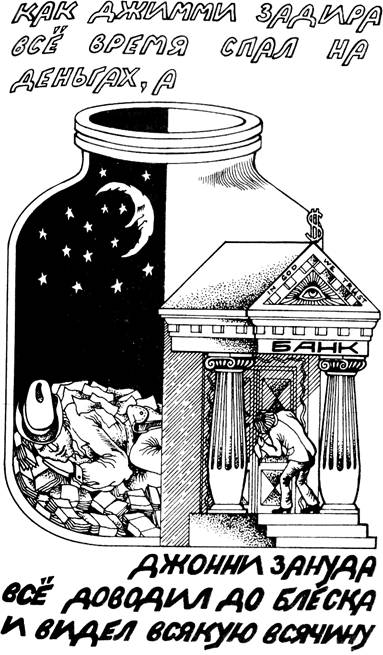А теперь Джимми Задира спит в комнате, полной денег, в большом банке в Ближних Курах. Комната, где он спит – то место, где хранят тясячедолларовые билеты. Когда он по вечерам устраивает себе постель на полу, тысячедолларовые бумажки доходят ему до колен. Вместо подушки у него куча тысячедолларовых бумажек. Как зарываются в сено или солому, он зарывается в тысячедолларовые бумажки. Бумажные деньги громоздятся вокруг него и собираются у него под локтем будто сено или солома.