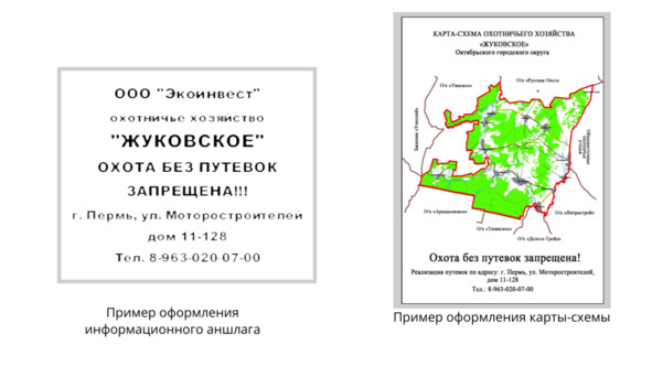 На основных въездах на территорию охотничьего хозяйства необходимо установить аншлаги в виде карта-схем с нанесенными границами хозяйства и указанием: