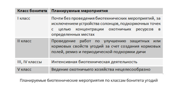 Ниже приведены планируемые биотехнические мероприятия по классам бонитета угодий.