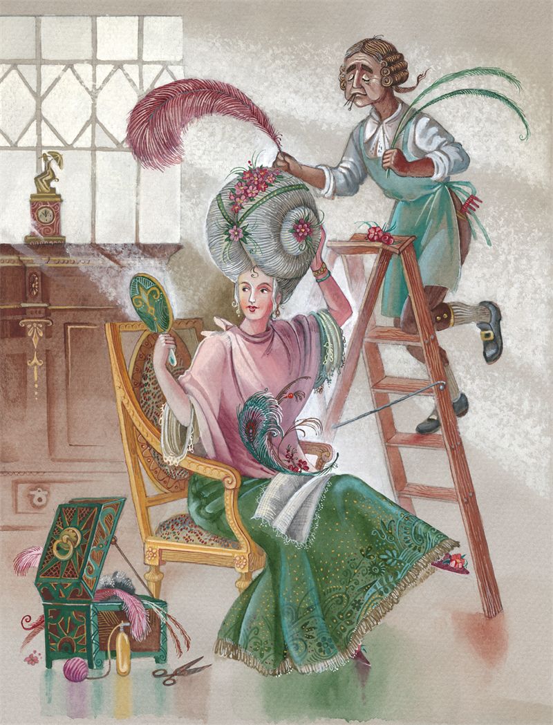 Потом, прошед через сени, обратились они к комнатам, где жили столетние старушки-голландки. Алёша никогда у них не бывал, но слыхал, что комнаты у них убраны по-старинному, что у одной из них большой серый попугай, а у другой серая кошка, очень умная, которая умеет прыгать через обруч и подавать лапку. Ему давно хотелось всё это видеть, и потому он очень обрадовался, когда курочка опять хлопнула крыльями и дверь в старушкины покои отворилась. Алёша в первой комнате увидел всякого рода старинные мебели: резные стулья, кресла, столы и комоды. Большая лежанка была из голландских изразцов[23], на которых были нарисованы синей муравой[24] люди и звери. Алёша хотел было остановиться, чтоб рассмотреть мебели, а особливо фигуры на лежанке, но Чернушка ему не позволила. Они вошли во вторую комнату, и тут-то Алёша обрадовался! В прекрасной золотой клетке сидел большой серый попугай с красным хвостом. Алёша тотчас хотел подбежать к нему. Чернушка опять его не допустила.