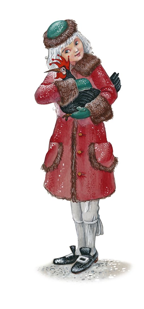 Алёша поспешно надел свою красную бекешу[20] на беличьем меху и зелёную бархатную шапочку с собольим околышком и побежал к забору. Когда он туда прибыл, курочки уже начали собираться на ночлег и, сонные, не очень обрадовались принесённым крошкам. Одна Чернушка, казалось, не чувствовала охоты ко сну: она весело к нему подбежала, захлопала крыльями и опять начала кудахтать. Алёша долго с ней играл; наконец, когда сделалось темно и настала пора идти домой, он сам затворил курятник, удостоверившись наперёд, что любезная его курочка уселась на шесте. Когда он выходил из курятника, ему показалось, что глаза у Чернушки светятся в темноте, как звёздочки, и что она тихонько ему говорит: