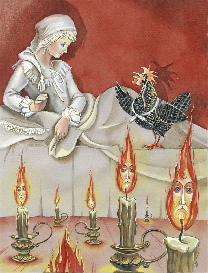 Тут она закудахтала странным голосом, и вдруг откуда-то взялись маленькие свечки в серебряных шандалах[22], не больше как с Алёшин маленький пальчик. Шандалы эти очутились на полу, на стульях, на окнах, даже на рукомойнике, и в комнате сделалось так светло, так светло, как будто днём. Алёша начал одеваться, а курочка подавала ему платье, и таким образом он вскоре совсем был одет.