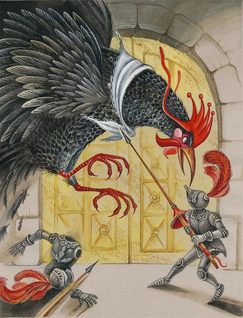 Они спустились вниз по лестнице, как будто в погреб, и долго-долго шли по разным переходам и коридорам, которых прежде Алёша никогда не видывал. Иногда коридоры эти так были низки и узки, что Алёша принуждён был нагибаться. Вдруг вошли они в залу, освещённую тремя большими хрустальными люстрами. Зала была без окошек, и по обеим сторонам висели на стенах рыцари в блестящих латах, с большими перьями на шлемах, с копьями и щитами в железных руках. Чернушка шла впереди на цыпочках и Алёше велела следовать за собою тихонько-тихонько… В конце залы была большая дверь из светлой жёлтой меди. Лишь только они подошли к ней, как соскочили со стен два рыцаря, ударили копьями об щиты и бросились на чёрную курицу. Чернушка подняла хохол, распустила крылья и вдруг сделалась большая-большая, выше рыцарей, и начала с ними сражаться! Рыцари сильно на неё наступали, а она защищалась крыльями и носом. Алёше сделалось страшно, сердце в нём сильно затрепетало, и он упал в обморок.
