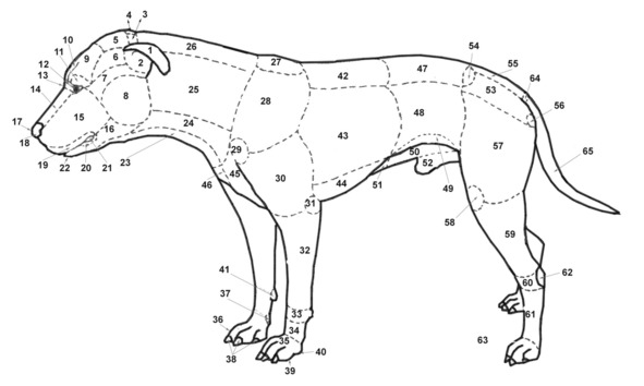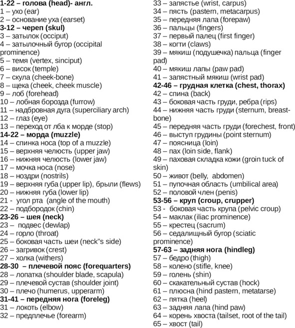 На рис. 1 обозначены экстерьерные стати собаки на русском и английском языках.