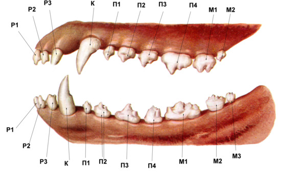 Р1, Р2, Р3 – резцы; К – клыки, П1, П2, П3, П4 – премоляры; М1, М2, М3 – моляры.