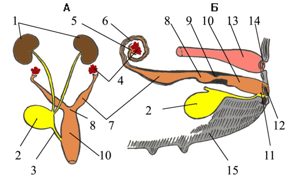 1 – почки; 2 – мочеточники; 3 – мочевой пузырь; 4 – семенники; 5 – придатки семенника; 6 – семяпроводы; 7 – мочеполовой канал; 8 – предстательная железа; 9 – пещеристое тело; 10 – косточка пениса; 11 – луковица головки; 12 – крайняя плоть (препуций); 13 – мошонка; 14 – брюшная стенка; 15 – кишка; 16 – анальное отверстие.