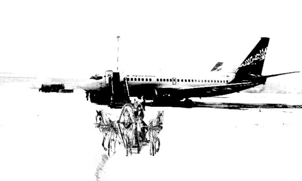 От здания аэровокзала прямо к самолету подкатила тройка коней запряженных в сани.