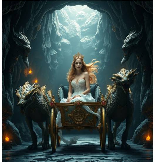 Между тем, наездница остановила свой странный экипаж и из тоннеля выбежали карлики, вооруженные длинными топорами. Гномы быстро окружили платформу красавицы и замерли, приняв боевую позу.