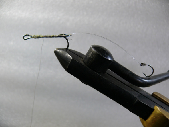 Сначала смазываем цевьё клеем и обматываем его вязальной нитью от колечка до начала поддёва двойника, укладываем леску и прихватив нитью у колечка делаем (леской) семь оборотов вокруг цевья виток к витку. Поверх фиксируем вязальной нитью и клеем. Остаток лески, цевьё и поводок с мелким крючком также обматываем до начала загиба, заботясь о прямом силуэте малька.