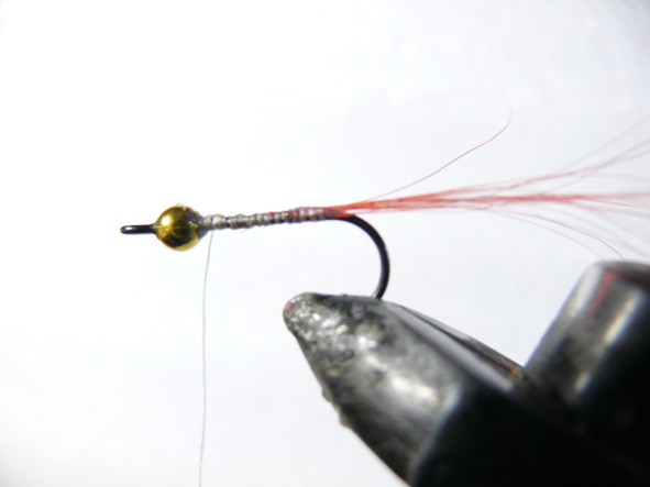 Итак, первое. Крючок с эффектом глаза вставляем в тисочки (можно столярные). Слегка покрыв цевьё клеем привязываем хвостик. Он не должен напоминать кисточку для бритья. Стремимся к понятию эфемерность, именно она и ловит. Вроде что-то есть, а вроде ничего и нет. Как трясущийся воздух над асфальтовой дорогой в начале американских боевиков (это когда идут титры и голос за кадром говорит: «штат Техас»). Как живой, недавно вылупившийся из икры, малёк, которого имитируем. Стараемся, чтобы клей также минимально попал и под головку, возле которой делаем 6 оборотов нитью. Бисерина зафиксирована.