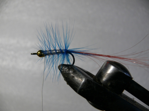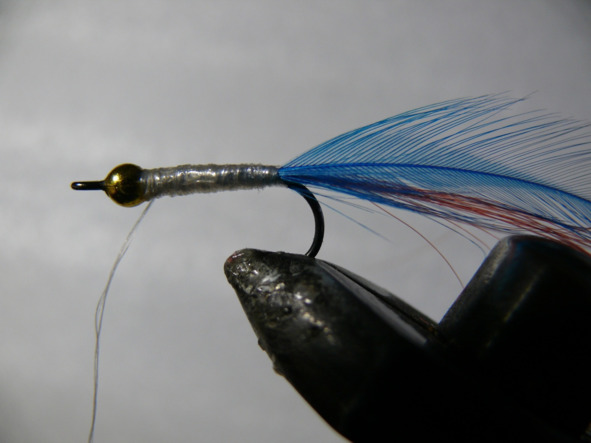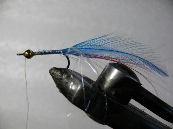 Наша последняя операция очень важна. По уже намотанному, красивому и ровному ёршику пера, пока клей сырой, с той же сегментацией безжалостно проходим вязальной нитью до хвоста и пару сегментов назад к головке. Здесь нить можно оборвать. А можно домотать до глаза-головки и оборвать там. При вязке мушек нить всегда обрывается для максимального натяжения, а не обрезается. Обрезается хвостик на длину ближних к нему ворсин петуха. Получившийся стример очень крепок.