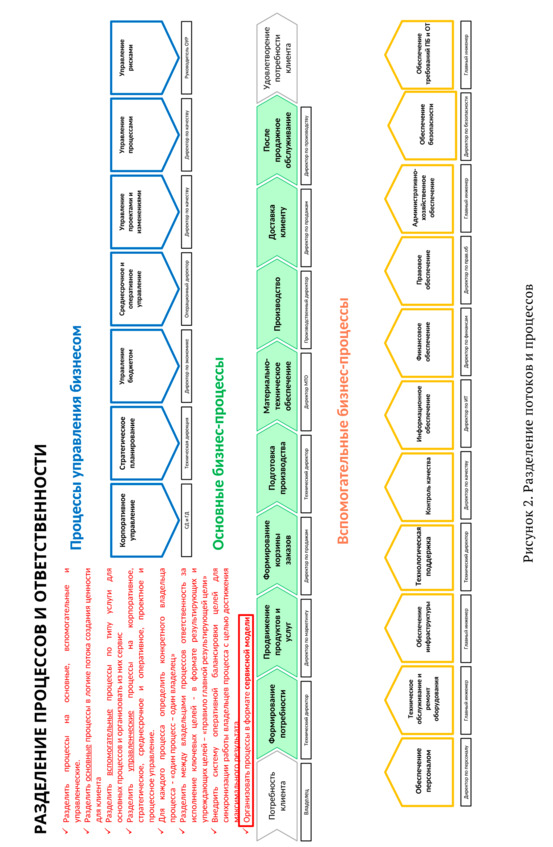 Наилучшим сценарием является клиентоцентричное разделение потоков и процессов: формирование узкоспециализированных потоков создания ценности, разделение процессов потока на основные, вспомогательные и управленческие процессы, а также организация этих процессов в формате сервисной модели (рисунок 2).