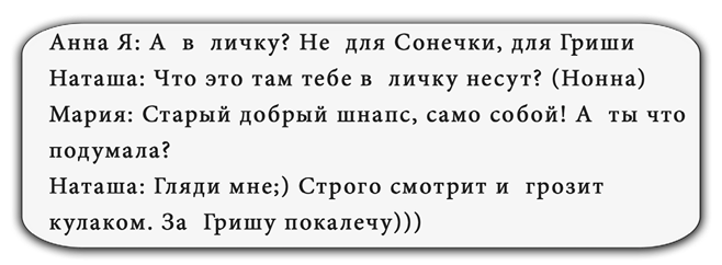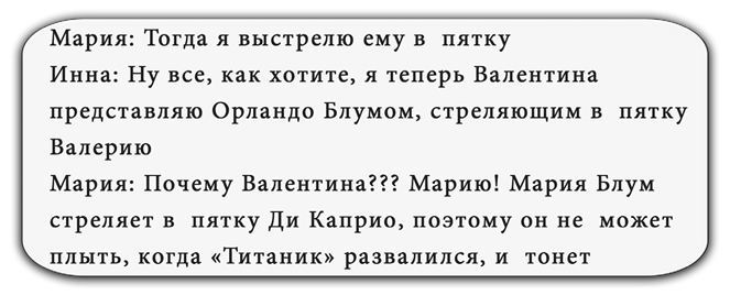 Пока собираются гости спектакля, расскажу немного о том, что происходило во время создания текстов для этого сборника. Мы с авторами встретились раньше – в виртуальном чате, познакомились, персонажей придумали и… понеслась! Сообщения сыпались ежесекундно, читать их не перечитать, юмор лился без остановки. И мне захотелось частичкой этой атмосферы поделиться.