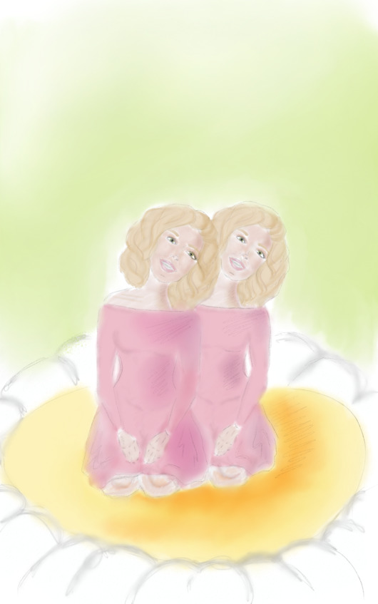 В самом сердце цветка стояли две совершенно одинаковые девочки-близняшки с огромным глазами и длиннющими ресницами.