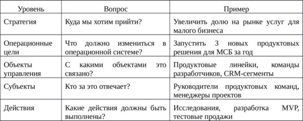 – Стратегия говорит, что нужно увеличить клиентскую базу. Операционная цель говорит, на каких сегментах, через какие продукты, каким способом, и кто за это отвечает.