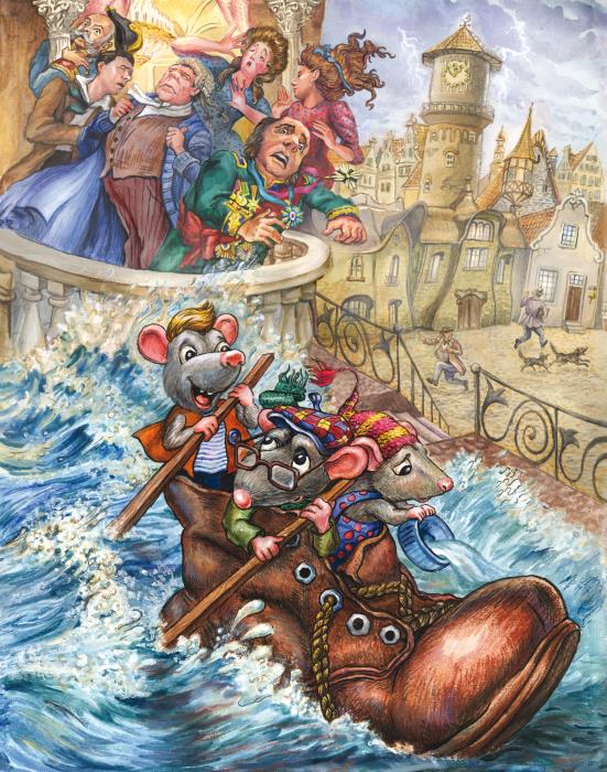 Ваш ботинок – наш фрегат,И я вновь ужасно радБурю встретить во весь рост.Так! Акулий зуб мне в хвост!Ботинок с крысятами вынесло к роскошному особняку. Пролетая на высокой волне у самого балкона, крысята увидели множество гостей в зале и среди них узнали Начальника порта – в том же мундире, как на портрете в конторе. Его награждали очередным орденом. Заметив волну, гости высыпали на балкон. Начальник порта, растолкав всех, прорвался к перилам, и высоченная волна пронесла ботинок с крысятами перед самым его носом. Начальника окатило водой. Волна смыла все его ордена.