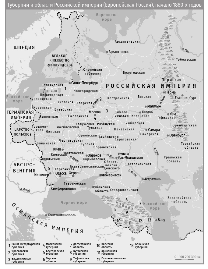 Это исследование сочетает в себе обсуждение права и правоприменения в позднецарской России с анализом централизованного государственного управления многокультурной империей. В нем рассматривается судебная реформа 1864 года и сформировавшаяся на ее основе правовая система как область межкультурного взаимодействия. Данное исследование содержит анализ как самого процесса внедрения современной судебной системы в Крыму и Казани – двух регионах, выделявшихся культурным разнообразием (см. карту 1), так и его последствий. Особое внимание при этом уделяется положению нерусского населения в пореформенной правовой системе, следствия которого анализируются в рамках данного исследования по двум направлениям. Во-первых, обсуждается значение правовых изменений для религиозной и национальной политики Российской империи, а во-вторых, взвешиваются вероятные преимущества использования имперского ракурса в изучении российской правовой системы и реформаторского процесса в целом.