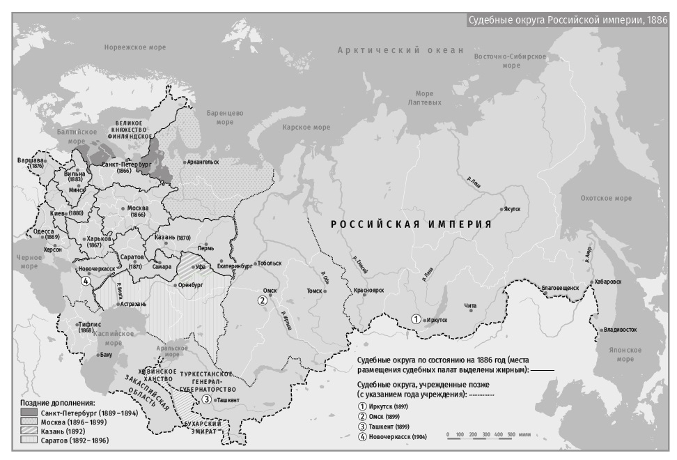 Хотя реформированные суды 1860‐х годов не были первыми судебными институтами, проникшими в провинцию, масштаб их распространения в последующие несколько десятилетий был беспрецедентным. Первоначально проект по распространению законности казался осуществимым только в двух категориях регионов: в традиционных центрах Европейской России и на прилегающих промежуточных землях, таких как Крым, Казань и степной регион юга России, который был охвачен окружными судами в Харькове, Воронеже, Саратове, Новочеркасске и станице Усть-Медведицкой. Однако несколько промежуточных территорий остались нетронутыми. Например, в Оренбурге и Уфе новые суды были учреждены только в 1892 году, поскольку правительство сочло эти регионы слишком слабо интегрированными в систему государственного управления. Более отдаленные регионы, как правило, присоединялись позже, в основном из‐за больших расстояний, отсутствия инфраструктуры и вытекающих из этого логистических проблем для правоприменения. Так, Крайний Север, Сибирь, степной район и Средняя Азия перешли на новую правовую систему только между 1896 и 1899 годами (см. карту 2)33.
