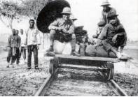 Ли Цзи (впереди слева) и Дун Цзобинь (впереди справа) лично занимаются транспортировкой оборудования на место раскопок руин Инь