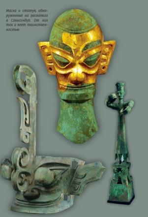 Маска и статуя, обнаруженные на раскопках в Саньсиндуе. От нихтак и веет таинственностью