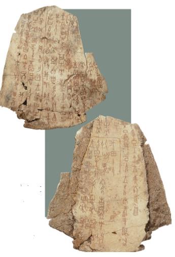 Кость с текстом периода правления императора У Дина из династии Шан. На лицевой и обратной сторонах выгравированы некоторые высказывания; иероглифы покрыты красной краской. Содержание высказываний относится к периоду правления У Дина: в тексте приводится описание трехдневного гадания касательно следующего вопроса – ждать ли в течение месяца какие-нибудь стихийные бедствия