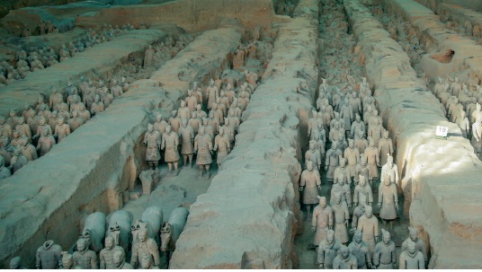 Терракотовая армия в гробнице императора Цинь Шихуана. Глиняные фигуры колесниц, боевых коней,воинов и т. д. являются атрибутами погребальной церемонии