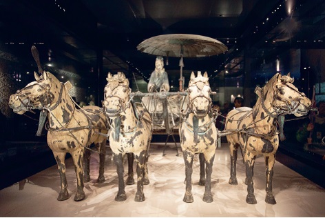 Бронзовые колесница и лошади в гробнице императора Цинь Шихуан-ди. Мастерски выполнены с большим изяществом, имеют близкое сходство с оригиналами. Корпус колесницы отлит из бронзы и украшен золотыми и серебряными элементами, его размер составляет примерно половину от размера на-стоящего человека и лошади