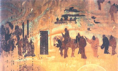 Дуньхуанская фреска «Картина прощания Чжан Цяня с императором У-ди перед миссией в Западные края». На картине Чжан Цянь с записной пластиной в руках прощается с императором, преклонив перед ним колени