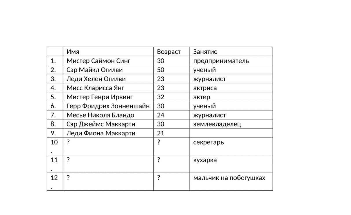 – Узнать как можно больше о собирающейся компании, – Ирвинг достал сигару. – Кроме вас, Клэр и леди Хелен, я больше ни с кем не знаком, – он задумался. – Я видел на обеде француза, месье Николя, но раньше мы никогда не встречались.