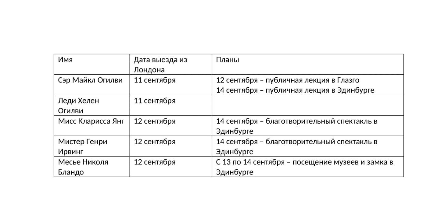 Мистер Синг ожидал их в замке Дункан в четверг, пятнадцатого сентября. Обиняком выведав у леди Хелен и мистера Ирвинга об их намерениях, Сабуров теперь заполнил последнюю ячейку. Первыми в Шотландию отправлялось семейство великого ученого.