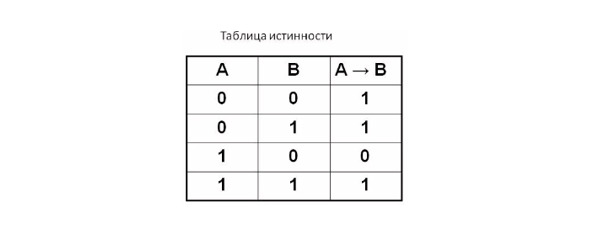 Логическая функция импликация. Обозначается cтрелкой ->. В языке программирования соответствует операции меньше либо равно <=. Как из лжи А=0 получить ложь B=0? Рассмотрим на примере A=2> 3 – ложь, то прибавим к обоим частям неравенства +2 и получим тоже ложь B = 4> 5. Если из лжи А=0 и B=0 можно получить ложь, значит, истина A -> B=1. A= -5> 3 – ложь, то обе части неравенства возведу в квадрат и получим уже истину B= 25> 9, тогда при A=0 и B=0 получаю, что А -> B=1. Из истины А=1 мы не можем получить B=0, поэтому A -> B=0. Если вы поняли смысл, как мы получили логические высказывания, то вам не потребуется зубрить таблицы истинности.