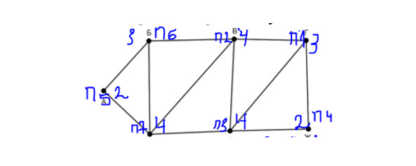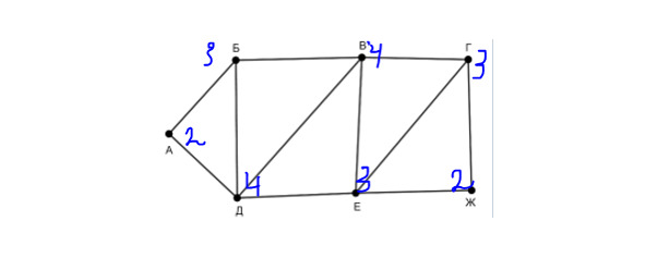 Им соответствует вершина А и Ж. Мы видим в таблице, что в П5 есть два пути. Поэтому предположим, что П5=А, тогда П4=Ж. Т. к. П5 пересекается в значении 10 с П6 и П6=3, то П6=Б. Аналогично получаем, что П7=Д. Далее П7 пересекается с П3, то П3=В. Т. к. П6 пересекается с П2, то П2=В, остается, что П3=Е. Осталась одна вершина – это П1=Г. Условие, что ВЕ> ВД, 23> 16. Это условие истинно, значит, наше предположение изначальное, что П5=А, а П4=Ж, а не наоборот – истинное. А если бы было ложное, тогда что? Тогда бы пришлось рисовать заново, предполагая, что П5=Ж, а П4=А. Смотрим по таблице пересечение П1 и П4 – это число 2. Ответ: 2.