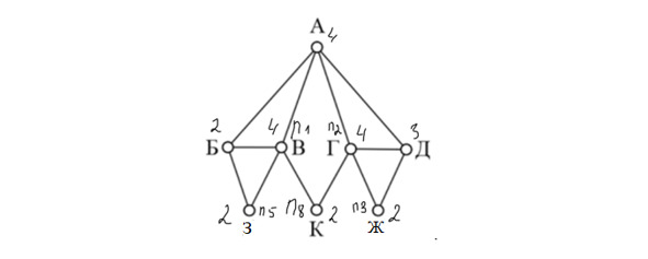Пункт К соединяется с вершинами Г (4 вершины) и В (4 вершины). П8 соединяется как раз с двумя вершинами П1 и П2, каждая из которых имеет по 4 дороги, значит, П8=К. Т. к. П8 соединяется с П1 и П2 имеет четыре вершины, то можно предположить, что П1=В, а П2=Г. П1 соединяется с П5, и т. к. П5 имеет 2 вершины, то П5=З. Ранее выяснили, что П2=Г и П2 пересекается с П3, которая имеет 2 вершины, значит, П3=Ж. Ответ: 35.