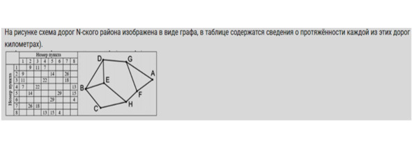 На рисунке слева схема дорог Н-ского района изображена в виде графа, в таблице содержатся сведения о длинах этих дорог (в километрах). Так как таблицу и схему рисовали независимо друг от друга, то нумерация населённых пунктов в таблице никак не связана с буквенными обозначениями на графе.