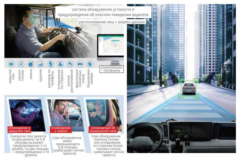 Интеллектуальные системы видеомониторинга и оповещения для дорожных транспортных средств включают в себя функции мониторинга поведения водителя, сигнализации о неисправности оборудования, мониторинга движения транспортного средства и идентификации водителя. В том числе функции мониторинга поведения водителя включают в себя автоматическое распознавание и сигнализацию о следующих ситуациях: усталость водителя, использование мобильного телефона во время вождения, длительное невнимание к дороге, отсутствие водителя на месте, курение за рулем, одновременное убирание обеих рук с руля и других.