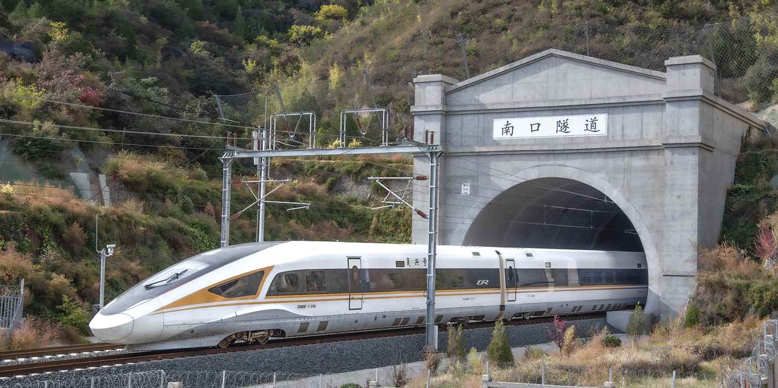 Высокоскоростной поезд «Фусинхао» на высокоскоростной железной дороге Цзинчжан (Пекин – Чжанцзякоу) выезжает из туннеля Нанькоу