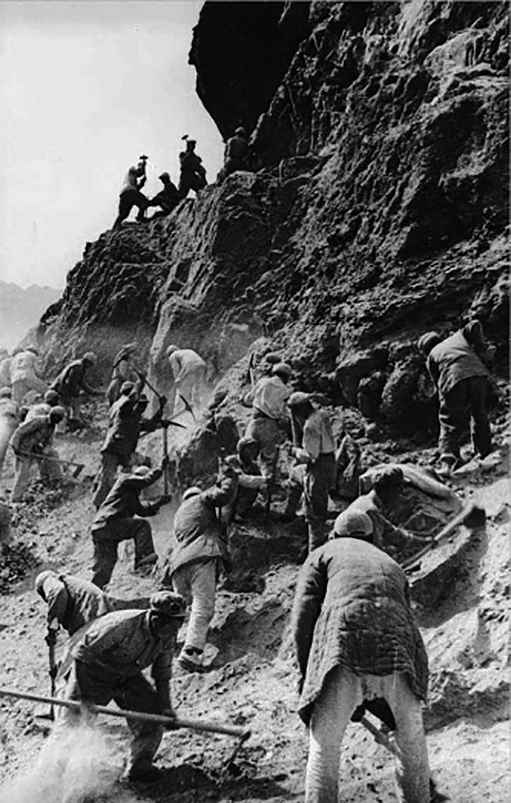 Солдаты и народы использовали молоты, стальные прутья и лопаты для прокладки дороги через горы