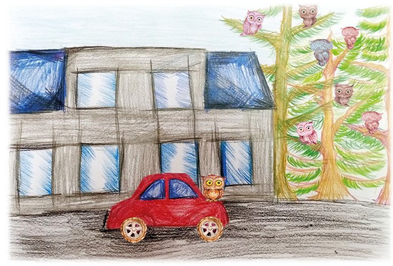 Совёнок спустился на ветку пониже и услышал, что женщина собирается в библиотеку. Она поставила сумку с книгами на заднее сиденье машины и села за руль. И Упе решил отправиться в библиотеку с ней. Он незаметно пристроился на багажнике, а тем временем машина выехала со двора.
