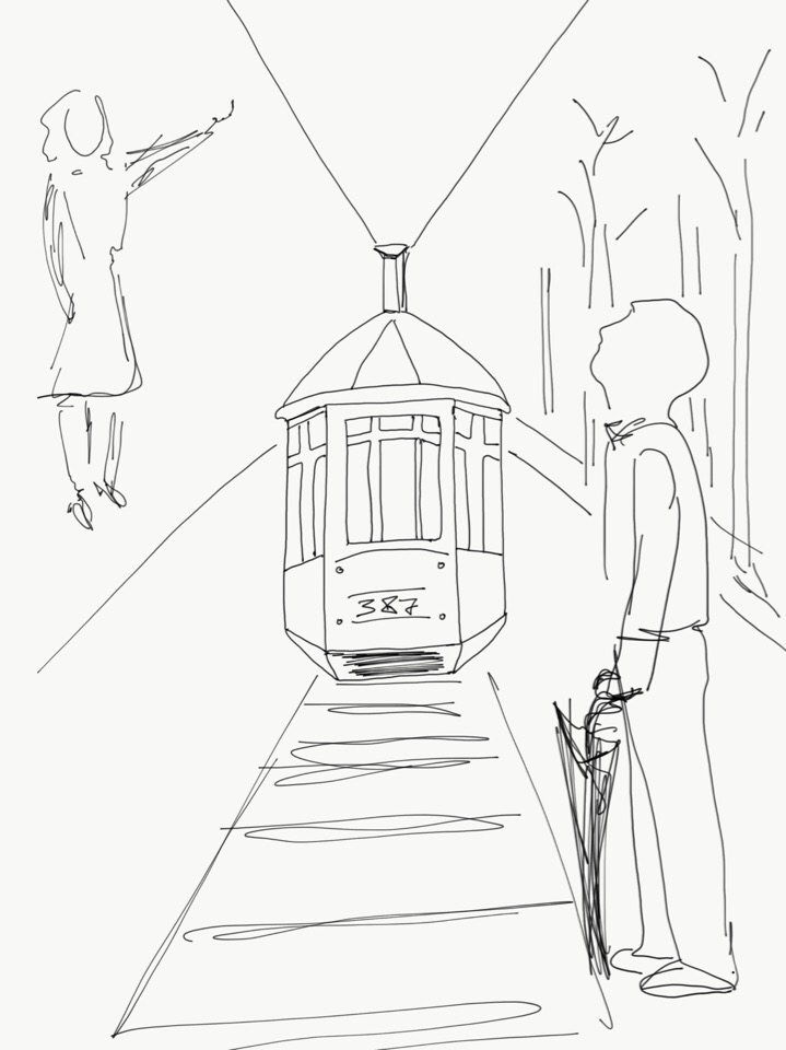 Гаэль ждёт трамвая. Он стоит, укутавшись в тёплое пальто, вместе с другими тёмными расплывающимися фигурами, застывшими в ожидании под проливным дождём. Вот уже двадцать минут трамвая нет.