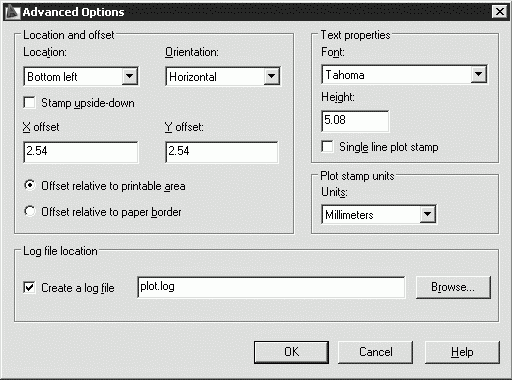 · в области Plot stamp units определяются единицы для штемпеля (дюймы, миллиметры или пикселы);
